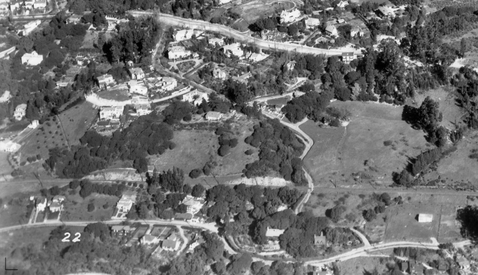 • This 1935 view of Temescal Cut and the overlying Berkeley Hills provides documentation for the vast reconfiguration by the Joint Highway District 13 of the eastern end of the Canyon to provide new roads to the northern and eastern flanks of Lake Temescal and the new tunnel. EBRPD Ref. USNPS-7-C